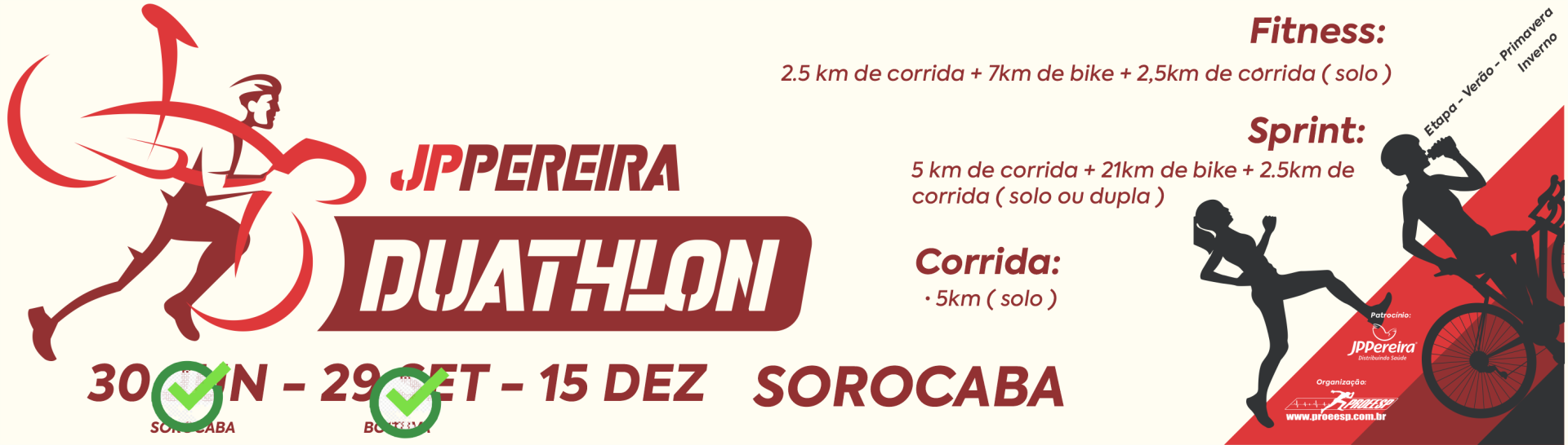 1.1. O Circuito Duathlon JP Pereira , doravante denominada EVENTO, será realizada na cidade de SOROCABA (SP) a última etapa, sob qualquer que seja a condição climática, com participação de PESSOAS DE AMBOS OS SEXOS, devidamente inscritas, doravante denominadas ATLETAS.