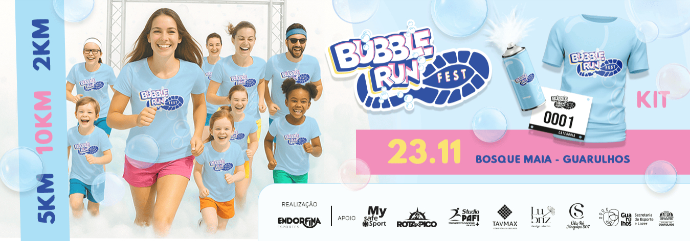 O kit da BUBBLE RUN FEST será composto por: camiseta manga curta e possíveis brindes, número de peito, chip de cronometragem, medalha finisher e Spray de espuma.