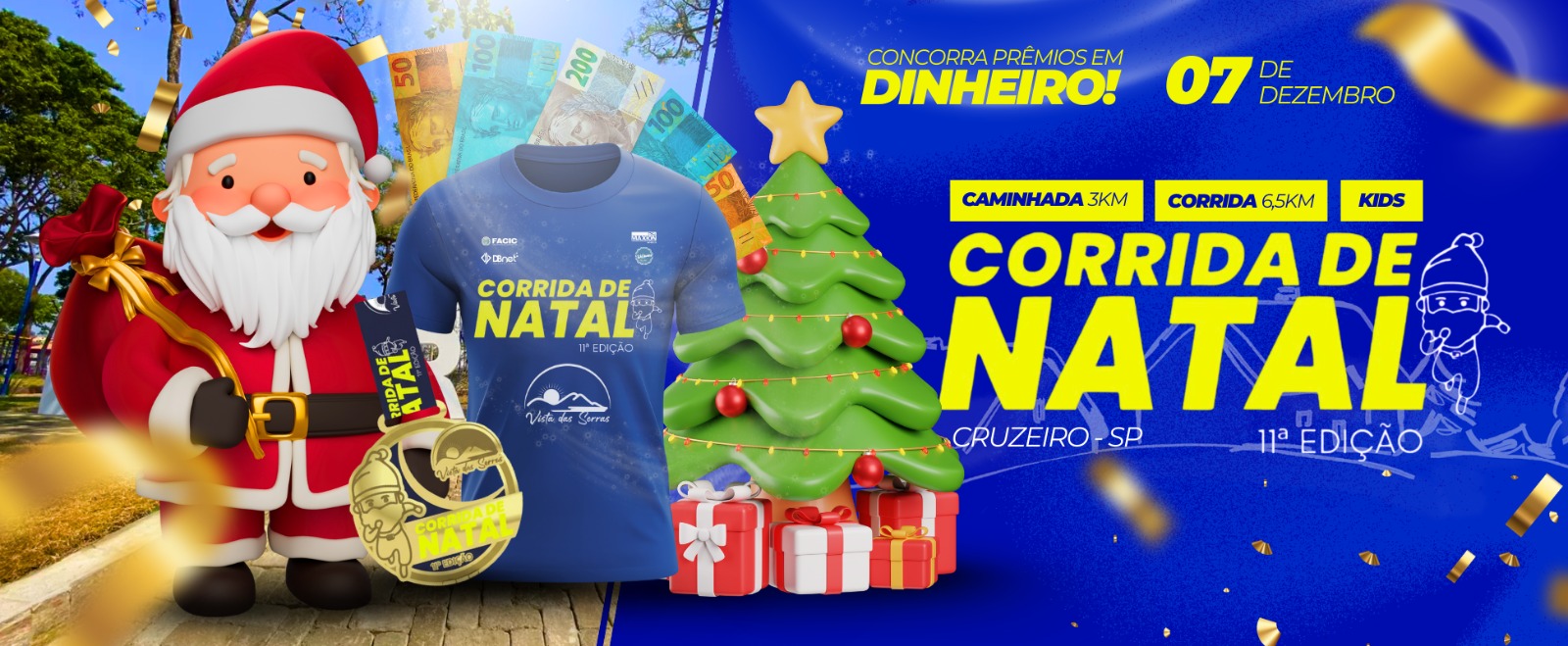 1.1. A Prova Pedestre 11ª CORRIDA DE NATAL CRUZEIRO 2025, doravante denominada EVENTO, será realizada no dia 7 de DEZEMBRO de 2025, na cidade de Cruzeiro, estado de São Paulo, por PESSOAS DE AMBOS OS SEXOS devidamente inscritas, doravante denominados ATLETAS.