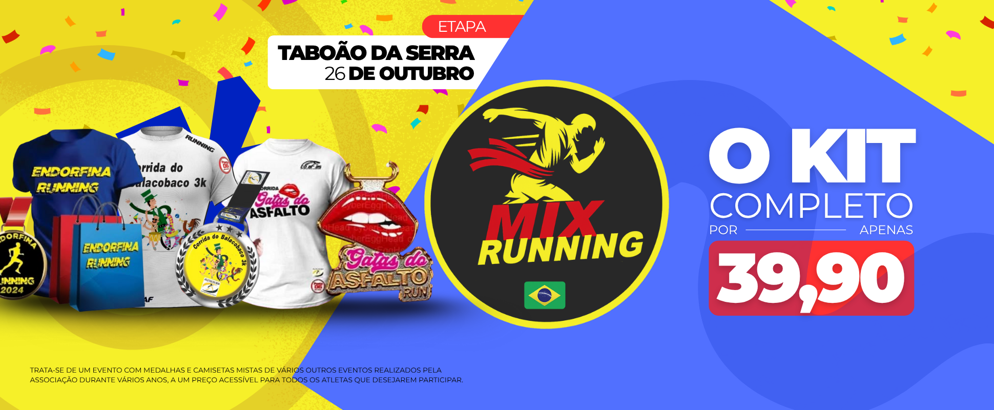 A corrida Mix Running , tem por objetivo, fazer com que os atletas que por algum motivo não tiveram a oportunidade de conquistar alguma medalha, ou camiseta referente a algum evento realizado pela Associação Atletas do Bem, a poderem usufruir dos kits de nossa entidade, participando de uma competição com troféus e medalhas reconfigurados dentro de uma competição com disputa para os 05 primeiros masculino e feminino.