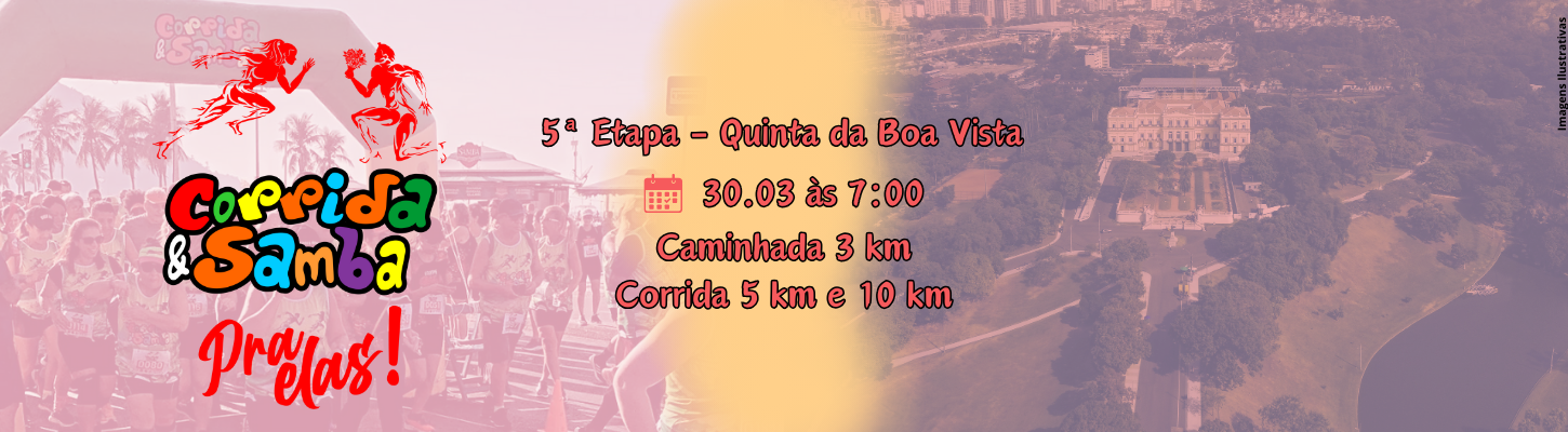O Evento Esportivo "5ª Etapa da CORRIDA & SAMBA - Pra Elas!", será realizado dia 30/03/25 na Quinta da Boa Vista, com largada em frente ao portão principal com participação de pessoas, homens e mulheres devidamente inscritos.